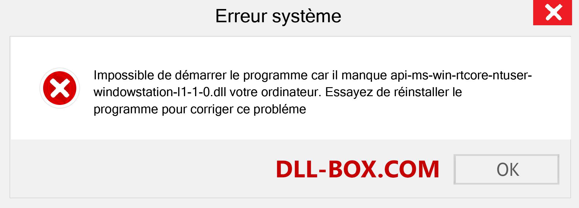 1. Le programme ne peut pas démarrer car api-ms-win-rtcore-ntuser-windowstation-l1-1-0.dll est absent de votre ordinateur. Essayez de réinstaller le programme pour résoudre ce problème.